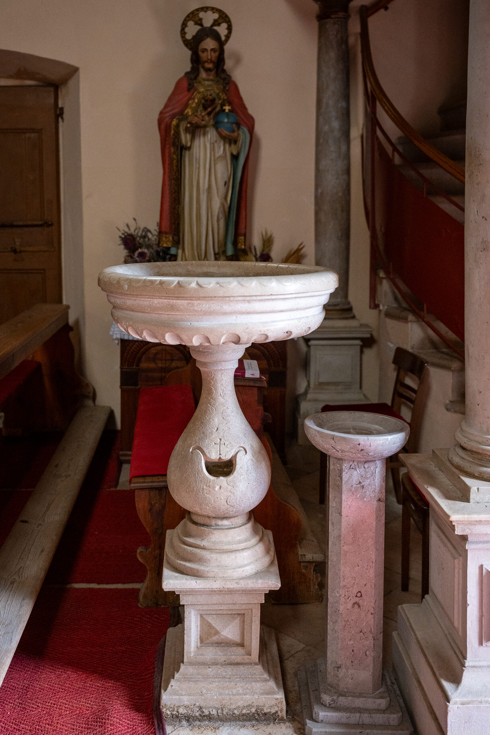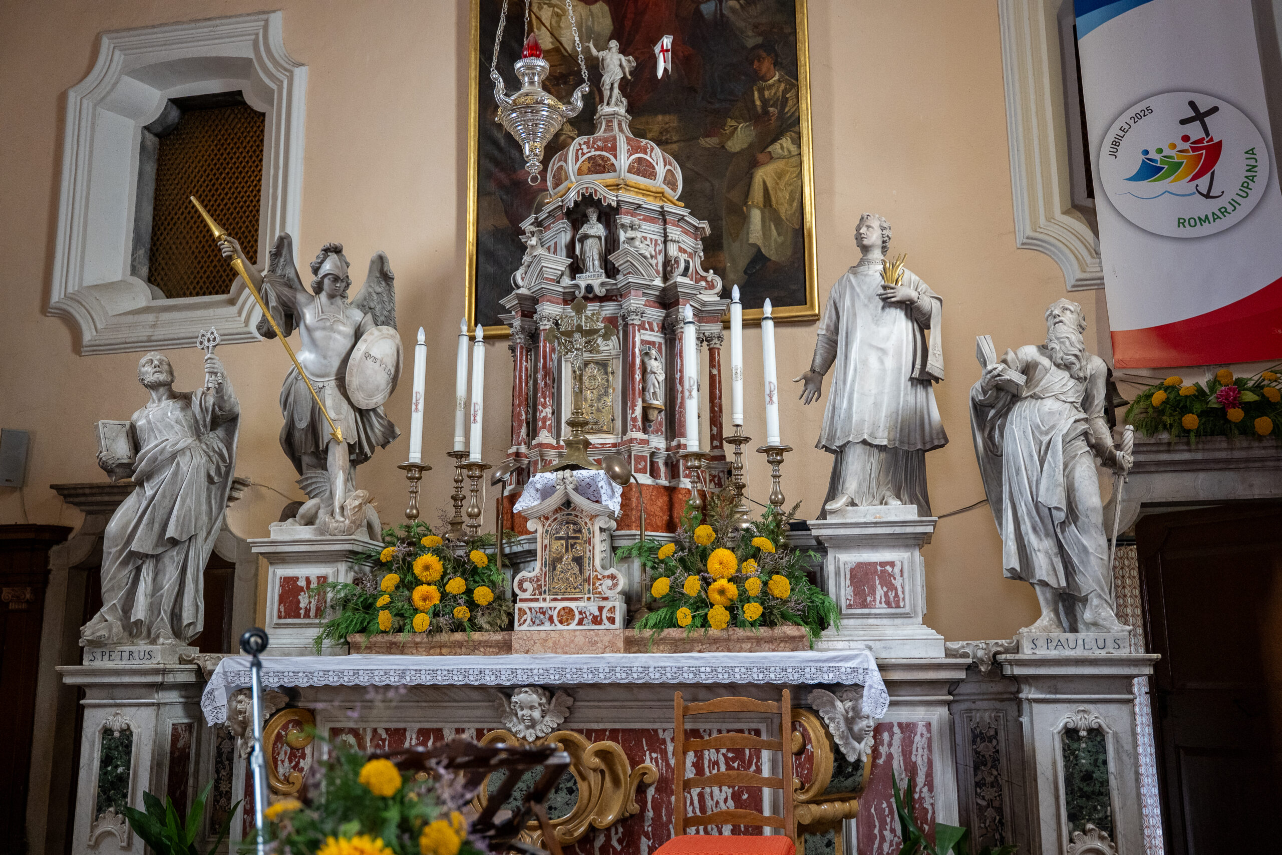 Tuż przed kościołem zagadnął nas jeden z mieszkańców. Kiedy dowiedział się, że jesteśmy z Polski, natychmiast wspomniał papieża Jana Pawła II, którego miał okazję poznać, a który okazał się postacią niezwykle ważną w życiu jego rodziny. Z uśmiechem na ustach, mężczyzna porzucił zamiatanie placu i wcielił się w rolę przewodnika. Pokazał nam wnętrze świątyni, zwracając uwagę na pewne „smaczki” w wyposażeniu, jak np. stojąca przy wejściu, kropielnica – wyjątkowa, bo posiadająca, ulokowany znacznie poniżej misy, niewielki otwór, przez który palce w święconej wodzie mogły zanurzyć dzieci. Mieliśmy też niezwykłą okazję zwiedzić zakrystię, która mieści się w… starym kościele, bowiem zanim we wsi Krkavče zbudowano kościół św. Michała Archanioła w obecnej formie, istniała tam mniejsza świątynia. Krótko mówiąc, budynek rozbudowano i przebudowano – najpierw w XVII wieku, a następnie w I połowie XVIII wieku – i tak stary kościół stał się zakrystią większej budowli.